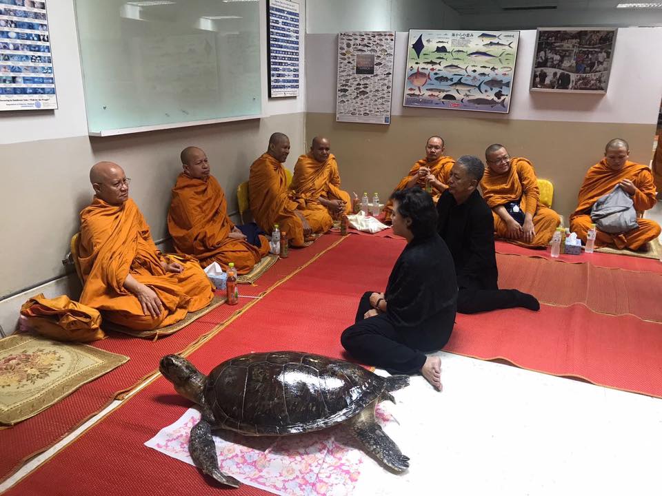 “The monks from Pathum Wanaram temple pray for Piggy Bank the turtle. We brought the remains of Piggy Bank, which have been preserved, to accept merit from the beginning to the end of the ceremony,” she wrote.