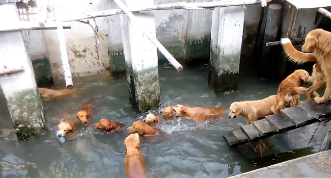 A herd of golden retrievers who shelter at a northern Bangkok temple were filmed escaping the heat to relax and play in the Chao Phraya River on Saturday.