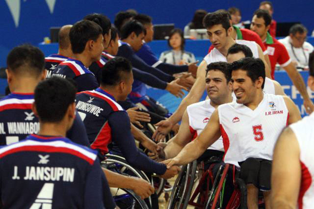 ABOVE: Iranian and Thai basketball wheelchair teams meet at a preliminary game on Oct. 19. Photo: Asian Para Games