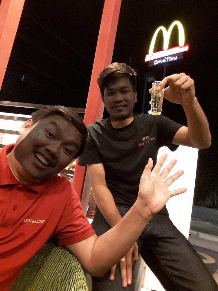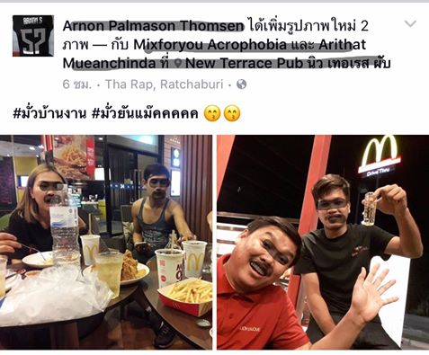 The photos, posted by the party people themselves, shows a group of three Thai men and one woman, drinking cheap lao khao (rice liquor) with soda while binging on McDonald’s fried chicken and fries.