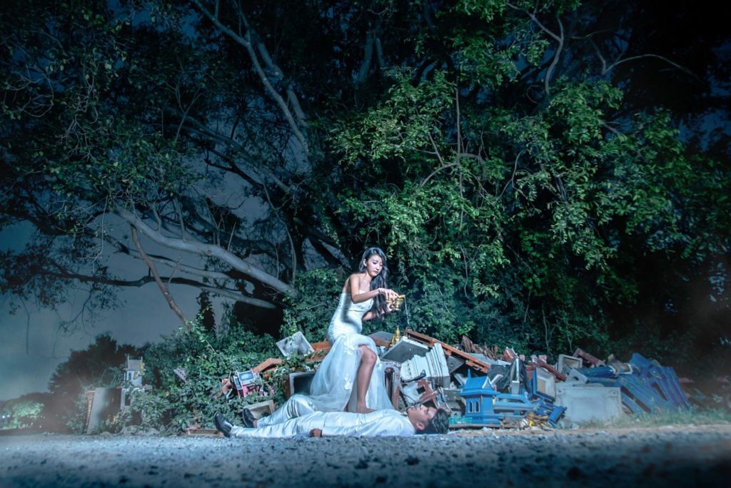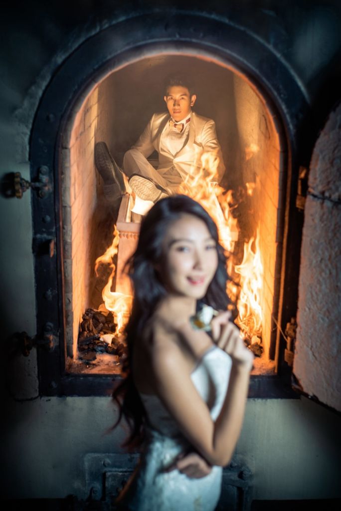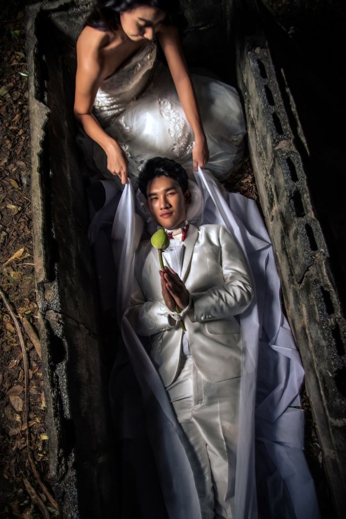 While there are plenty of unique wedding themes out there for brides and grooms, one Thai couple captured the apocalyptic moment with a coffin, crematorium and raging funeral pyre.