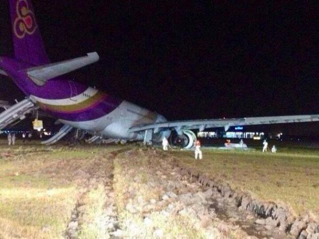 A Thai Airways plane skidded off the runway in Bangkok after the nose wheel collapsed on landing, slightly injuring more than a dozen passengers, the airline said Monday.