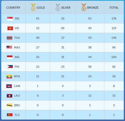 With 52 gold medals, 26 silver medals and 45 bronze medals, Vietnam recaptured the No. 2 spot over Thailand’s 49 gold medals, 57 silver medals and 43 bronze medals.