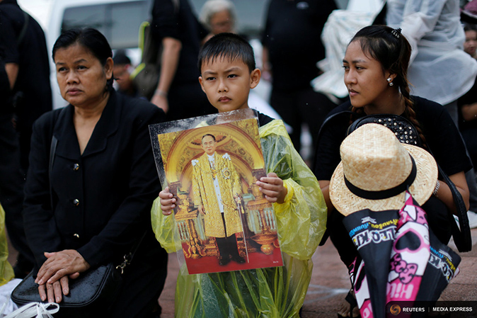 In Dinso road, a stone’s throw from the Grand Palace, where King Bhumibol’s remains will be kept for about one year until a royal cremation is held, shops selling gold-framed portraits of the king were packed and business was brisk.
