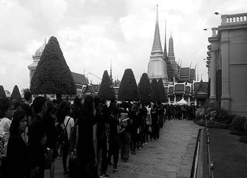 Thais from all across the country, all dressed in black, gathered in the area outside the Grand Palace waiting in line to enter Sahathai Samakhom Pavilion to pay homage before an image of the late HM the King.