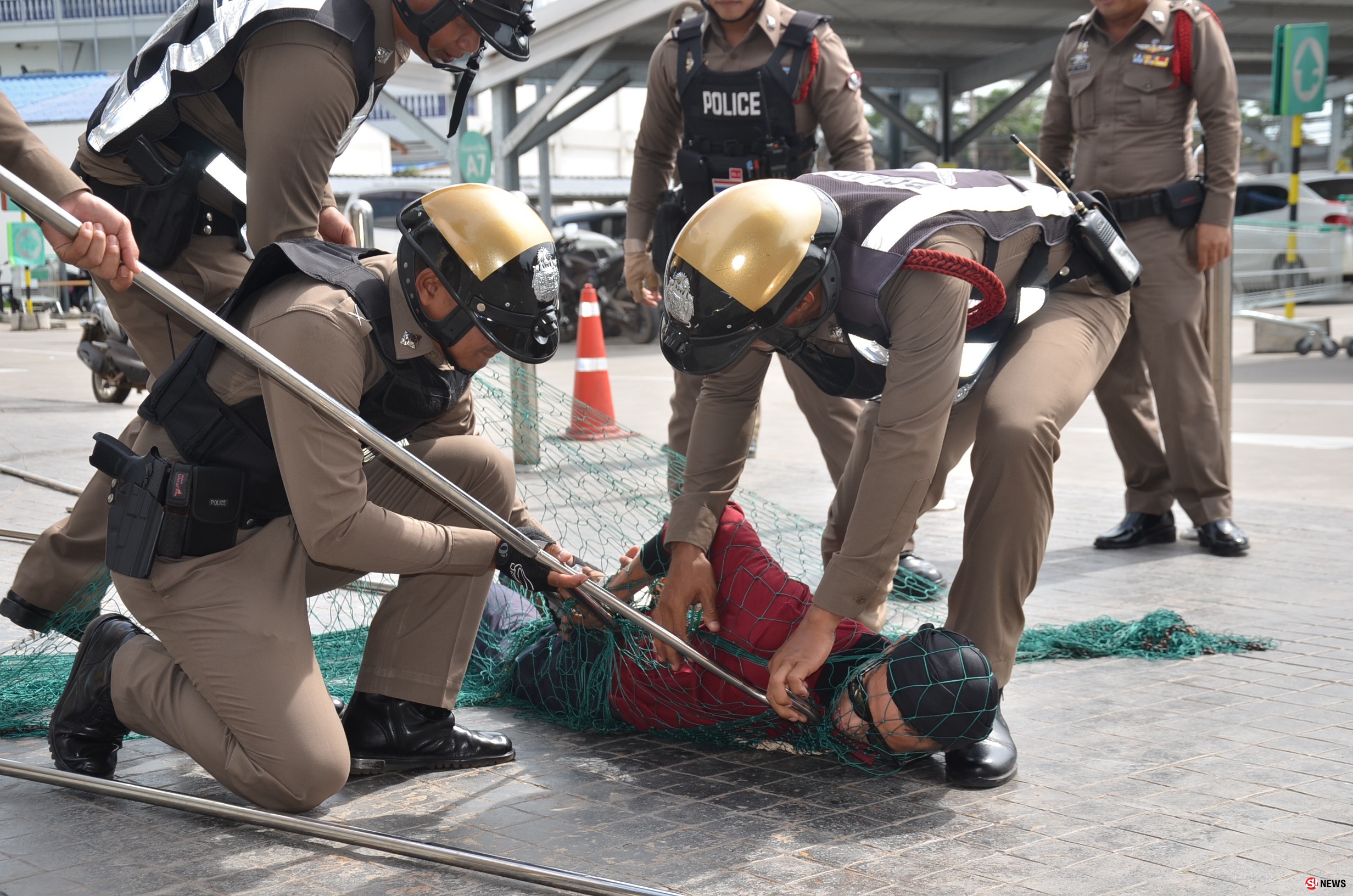 In a public exhibition/stunt held today at the province’s largest mall — Tesco Lotus — police demonstrated how they could arrest a knife-wielding assailant by tossing a net over him.