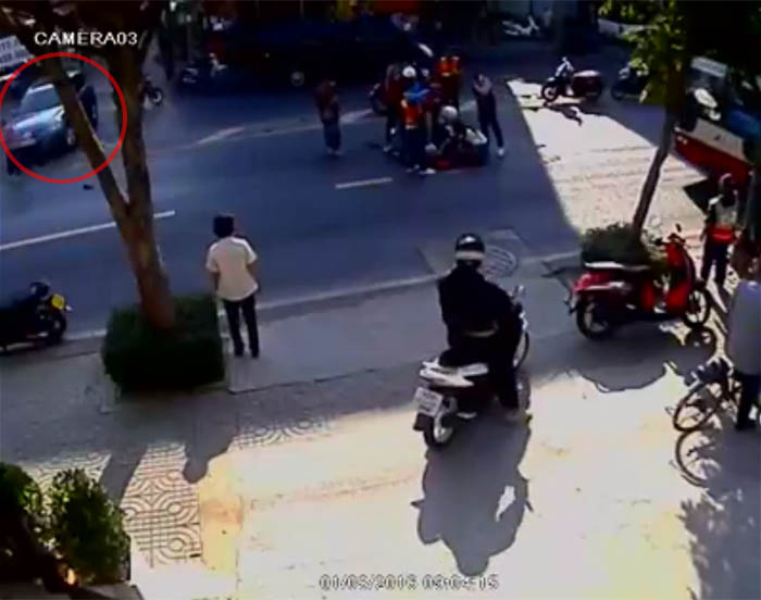 The woman says the car abruptly came out of Soi Pridipanomyong 20/1 and crashed into the motorcycle she was riding, flipping the bike over and sending her flying about 20 meters across the road.