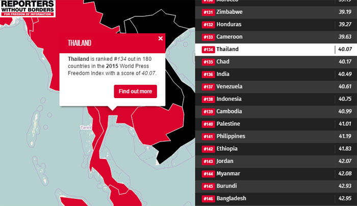 Thailand’s press freedom ranking dropped four places to rank 134 out of the 180 countries measured in the 2015 World Press Freedom Index. The country ranks 13th among other Asian Pacific countries with Hong Kong and Singapore ranking 8th and 26th respectively.