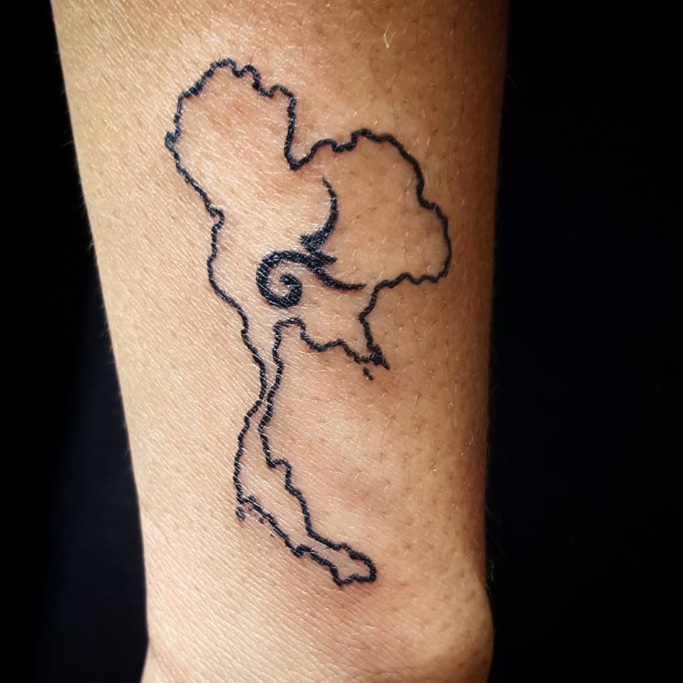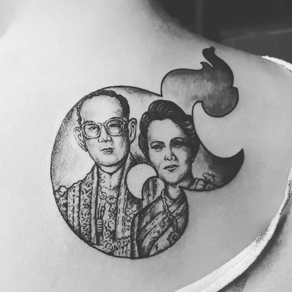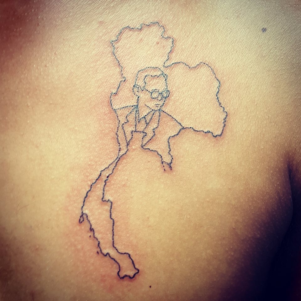 The tattoo designs include monochromatic portraits of the King and Queen, stylized versions of the number nine, to represent King Rama IX, the other name for the late King Bhumibol, and outlines in the shape of Thailand.