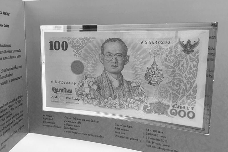 The bills, which show a denomination of THB100 and are sold in a commemorative paper cover, cost THB200 and sales are limited to five bills per person. The bill in an acrylic frame costs THB500 and those are limited to one bill per person.