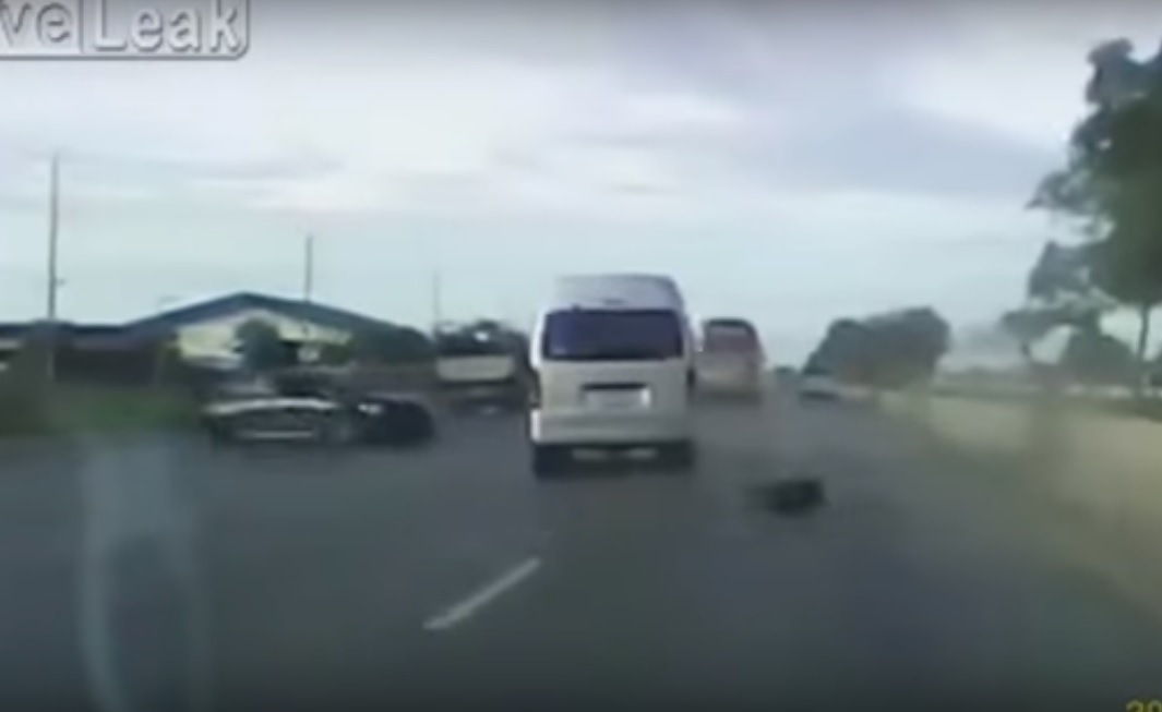 Eventually the sedan triumphs and overtakes the minivan, but the driver’s victory is shortlived as he then slams into the road safety barrier and spectacularly spins wildly out onto the other side of the road, sending a wheel flying in the process.