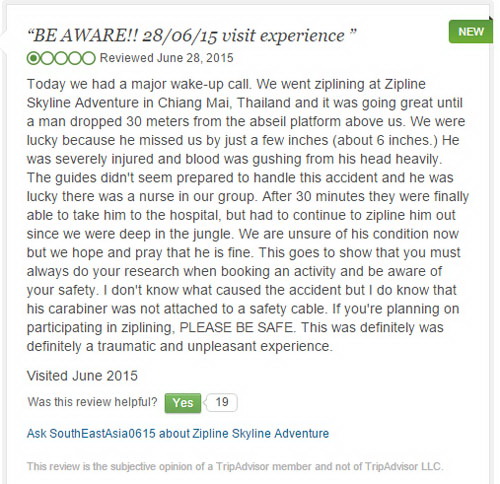 “He was severely injured,” a user SouthEastAsia0615 wrote Sunday on TripAdvisor. “The guides didn’t seem prepared to handle this accident, and he was lucky there was a nurse in our group. After 30 minutes they were finally able to take him to the hospital, but had to continue to zip-line him out since we were deep in the jungle.”