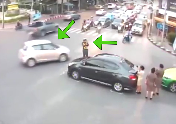 The video, which was posted on YouLike yesterday, shows a minor collision in the middle of the intersection between a black car and a taxi last month, causing two policemen who were located at the Dusit police station to come over.