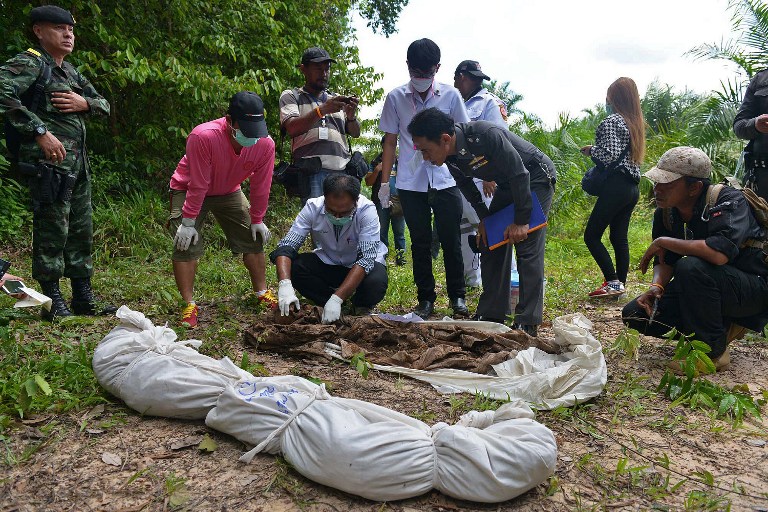 ABOVE: Rescue workers inspect human remains dug from graves May 6 about one kilometer from the site where shallow graves containing 26 bodies were found May 1 near the town of Padang Besar in the southern province of Songkhla. Photo: AFP