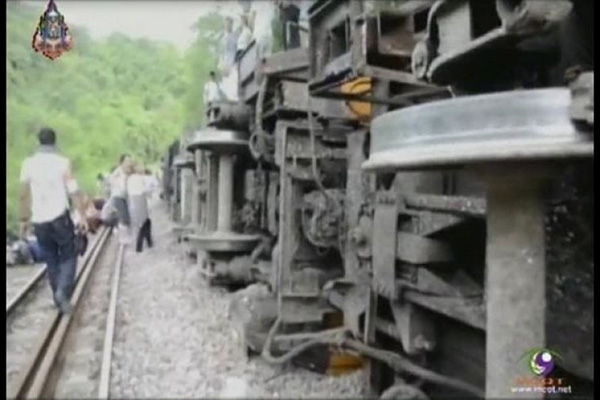 Seven carriages of the Bangkok-Chiang Mai train derailed in Denchai district.