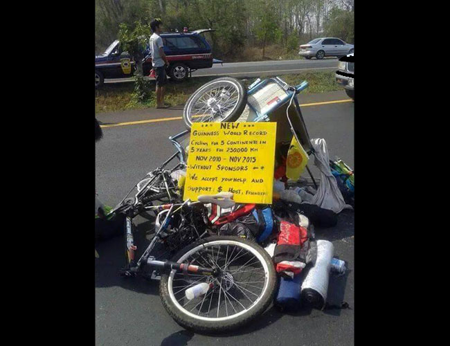 Guillermo was on a five-year mission to cycle 250,000 kilometers across five continents and set a Guinness World Record. He was eight months from finishing when Thiwarat’s truck swerved into his lane and struck him on Feb. 21 in front of his wife and 2-year-old son, who were also injured.