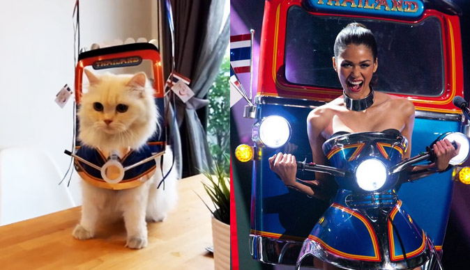 As the nation celebrates its victory in having the best national costume in this year’s Miss Universe pageant, this fashionable feline was obviously inspired by Miss Thailand’s tuk tuk dress and turned her soi into a catwalk… and it is the BEST CAT VIDEO you’ll see this year.