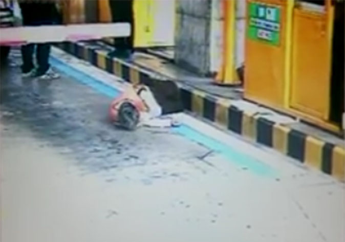 A security guard at Bangkok’s Sirat expressway was knocked out by a passenger in a pickup truck this morning because the guard refused to let his truck go through an Easy Pass toll booth lane since he didn’t have a card.