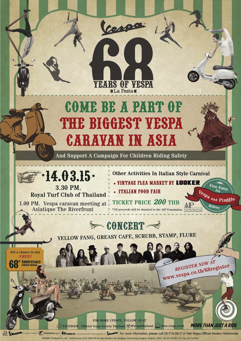 Vespiario (Thailand) Co., Ltd., (the sole Vespa distributor in Thailand) has an idea: make motorbike safety fun. Being safe and having fun at the same time, you say? How about joining the biggest Vespa caravan in Asia as part of the 68 Years of Vespa La Festa on March 14th and contributing to road safety at the same time?