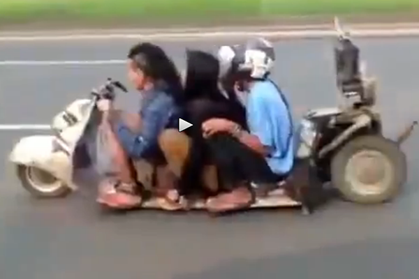 The video, which was apparently taken along highway 21 in Petchaboon Province, shows three individuals squeezed together and squatting on a scooter.