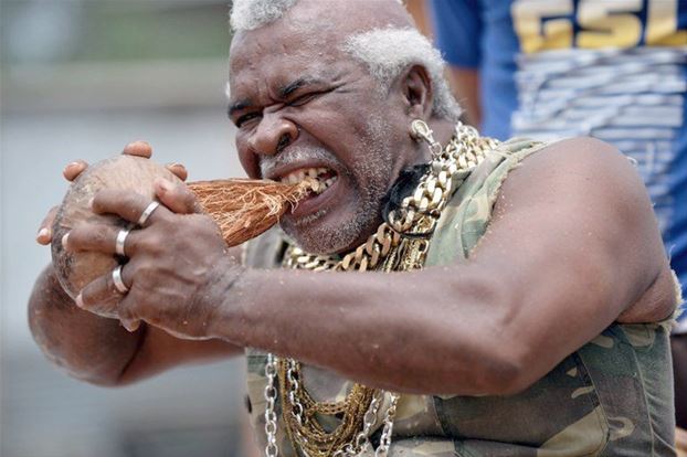“Peeling coconuts is not as easy as you all think,” says Gardin. “To peel coconuts, you’ve got to have jaw power. You’ve got to have teeth power. And you’ve got to have God’s power.”