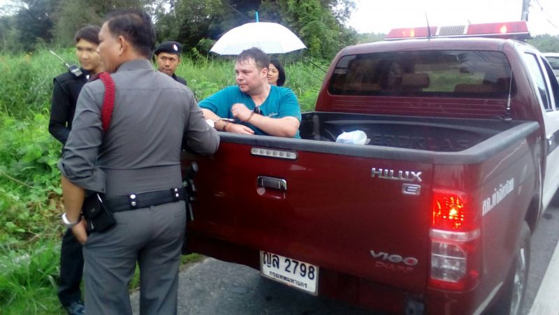 Tha Chatchai Police Lt. Thanom Thongpan said he received a call from a local at 5:30am reporting that a drunken foreigner was running around frantically in the northbound lanes of Thepkasattri Road smashing the windows of passing vehicles that were forced to stop when he walked into their paths.
