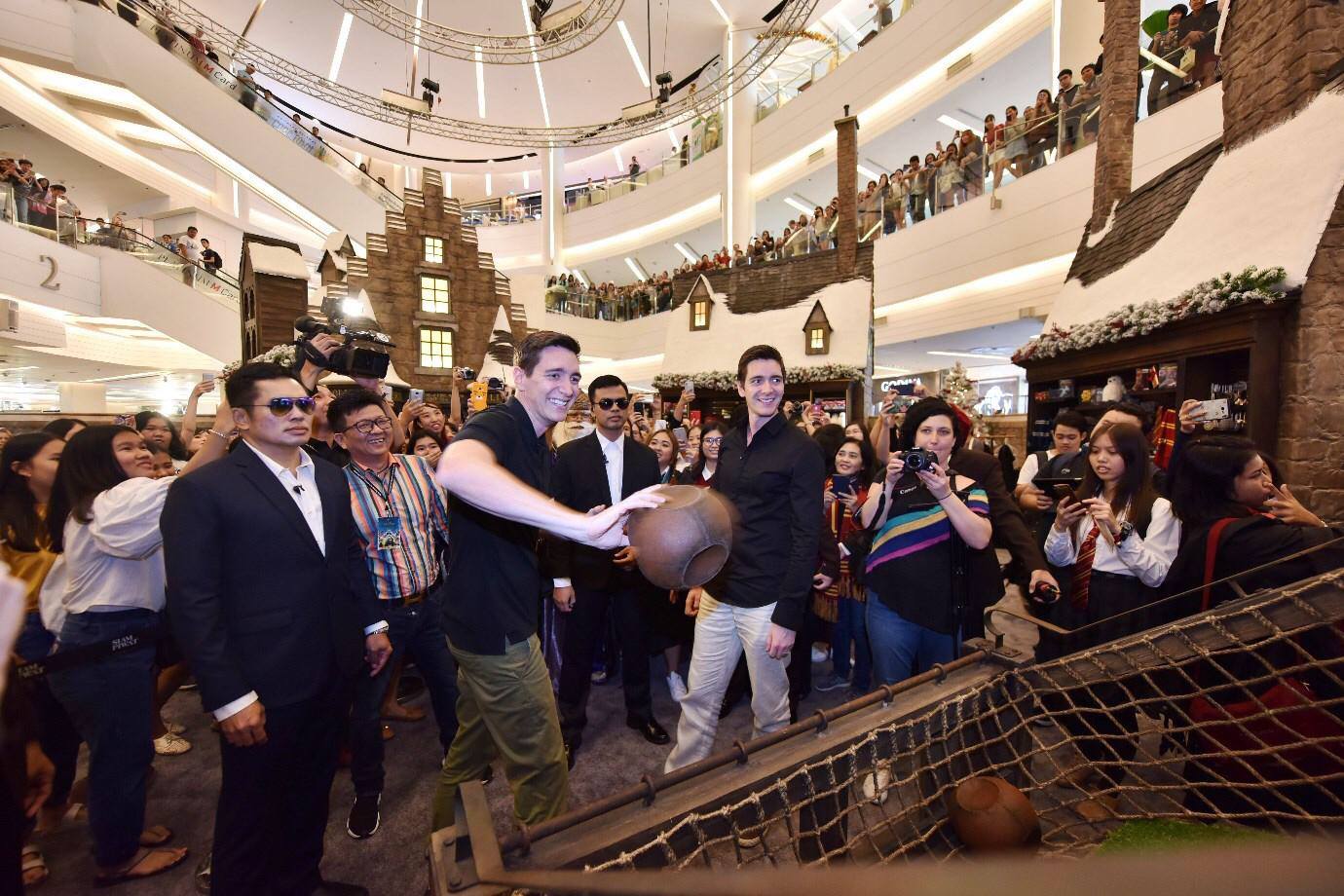 James and Oliver Phelps, the English actors who played Fred and George Weasley in the Harry Potter movies, received a warm welcome from fans as they attended the opening of the Harry Potter exhibition in Bangkok on Sunday morning.