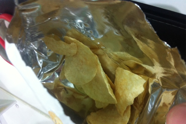 So this is what is in the smallest bag of Lay’s: six chips and some cracked pieces. So that makes it seven-heaven.
