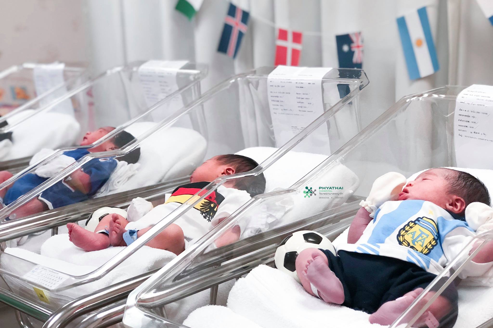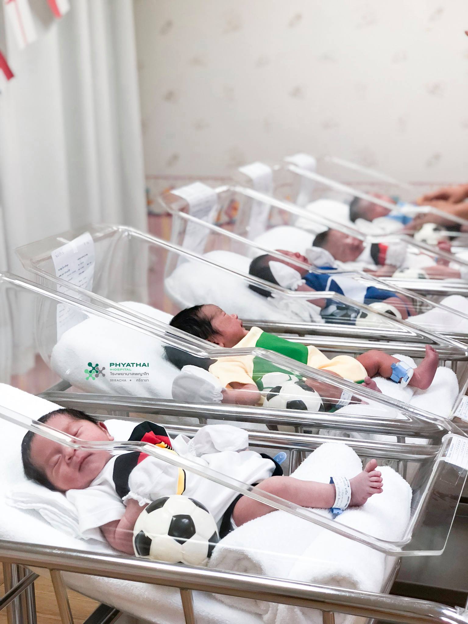 The hospital, located in Sri Racha, said it will keep the World Cup theme going until July 15, noting that the football jerseys they use have been sanitized and are made from fabrics safe for babies.