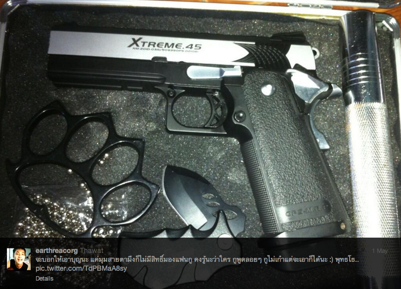 The tweet Thawat sent to some 118,000 fans that follow his account, @earthreacorg, was reportedly intended to fend off other men from his girlfriend. According to NewsLike.in.th, despite showing just an air gun, Thawat has been widely criticized for his immaturity and violent personality.