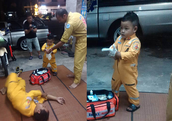 The volunteers teach Bhum how to perform CPR and first-aid. His parents are confident their son will grow up to be a rescue volunteer, Sanook reported.