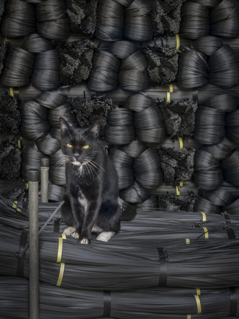 But like the last book, the backdrop of each photograph in the new book represents a portrait of Hong Kong’s culture. Heijnen’s favorite photo from the new book features a black cat sitting on piles of plastic ties used to tie bamboo scaffolding together.
