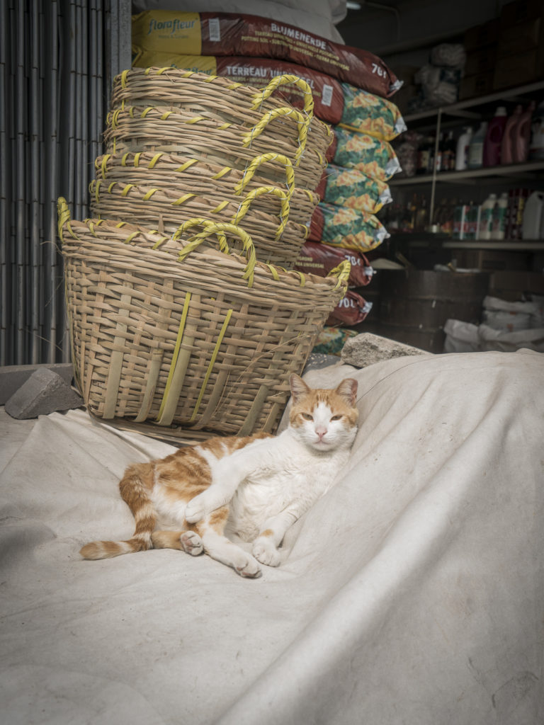 “The markets are more chaotic and less clean than the shops. Boxes, crates, grimy walls, forklifts, pallets. More human activity and perhaps a bit less of a connection between the owner and the cat. Markets are busy places in which fresh goods move rapidly. They make for more dynamic subject matter.”