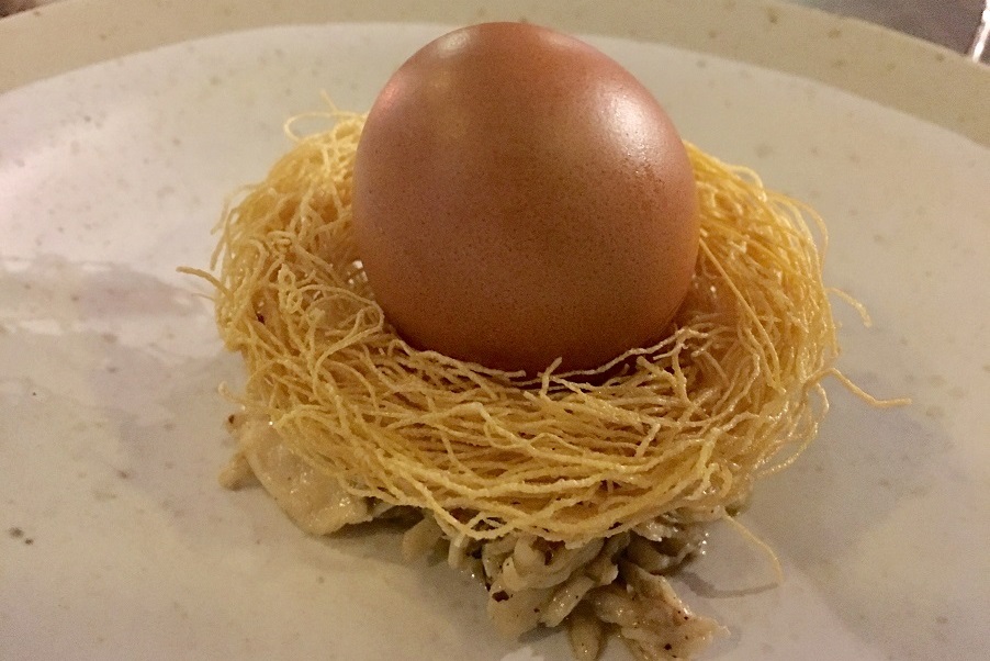 The third course was “the nest”, an adorable rendition of the Japanese dish of roast chicken and soft boiled eggs on rice, oyakudon, which in English translates to the somewhat macabre “parent and child rice bowl”.