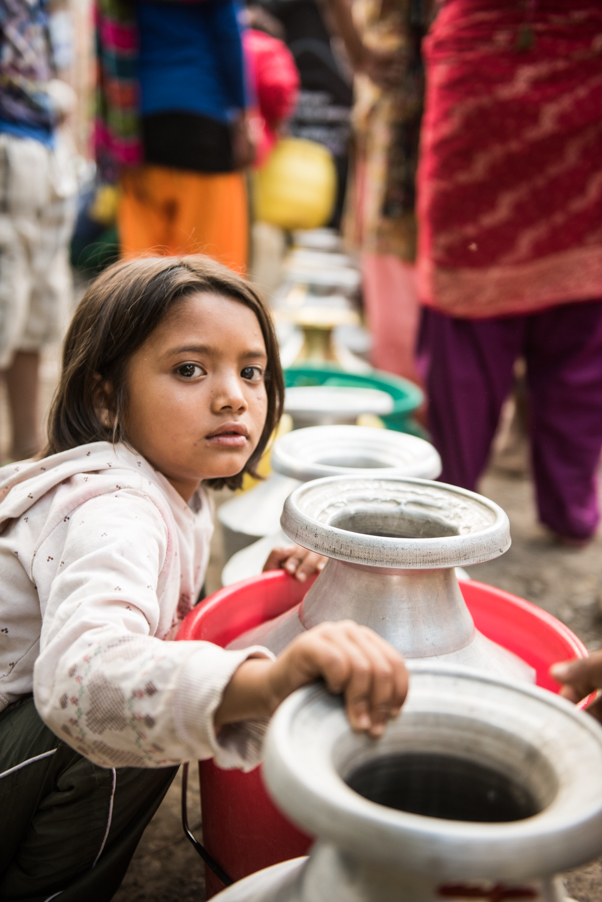 A girl waits in line to fill a jug with drinking water supplied by a non-profit organisation in the city of Bungamati on May 4, 2015.