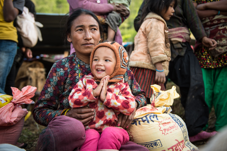 A woman and her child sit by donated relief supplies in a village in Sindhupalchowk on May 1, 2015.