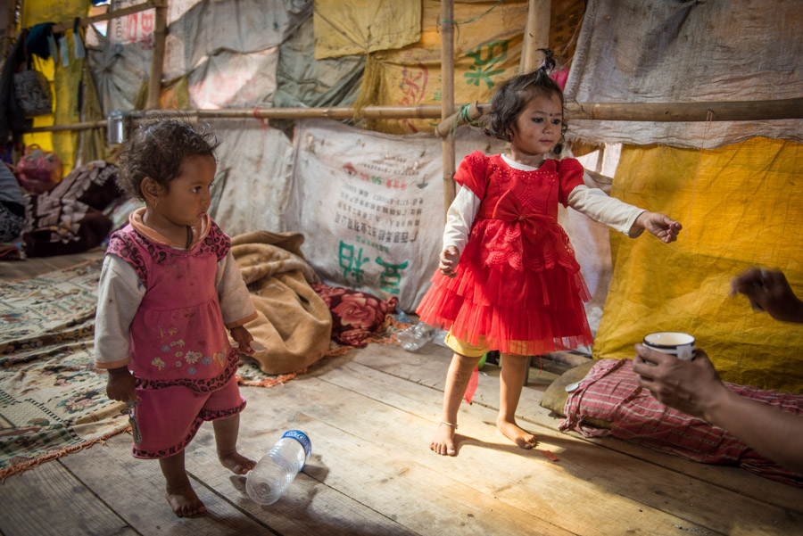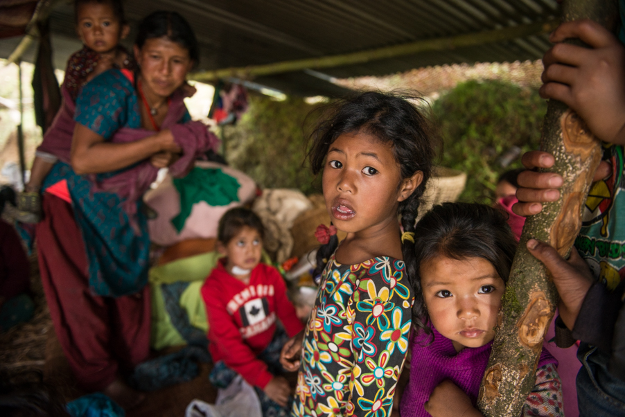 Children playing in a market stall repurposed as temporary shelter in Bhaktapur on May 3, 2015. An estimated 1.7 million children were affected by the earthquake.