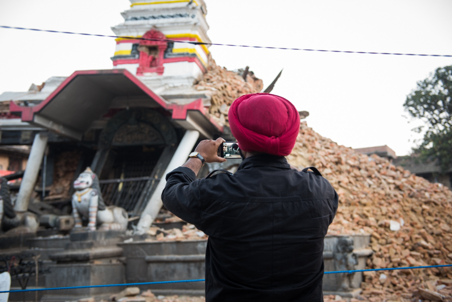 A man photographs a collapsed temple in the village of Bungamati on May 3, 2015.
