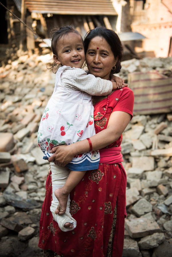 A mother and her young daughter, who fractured her leg in the earthquake, stand in front of the remnants of their house in Bhaktapur on May 3, 2015.