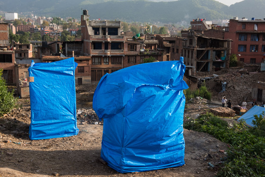 Temporary latrines have been set up on the edges of some camps, like these in Bhaktapur on May 3, 2015.