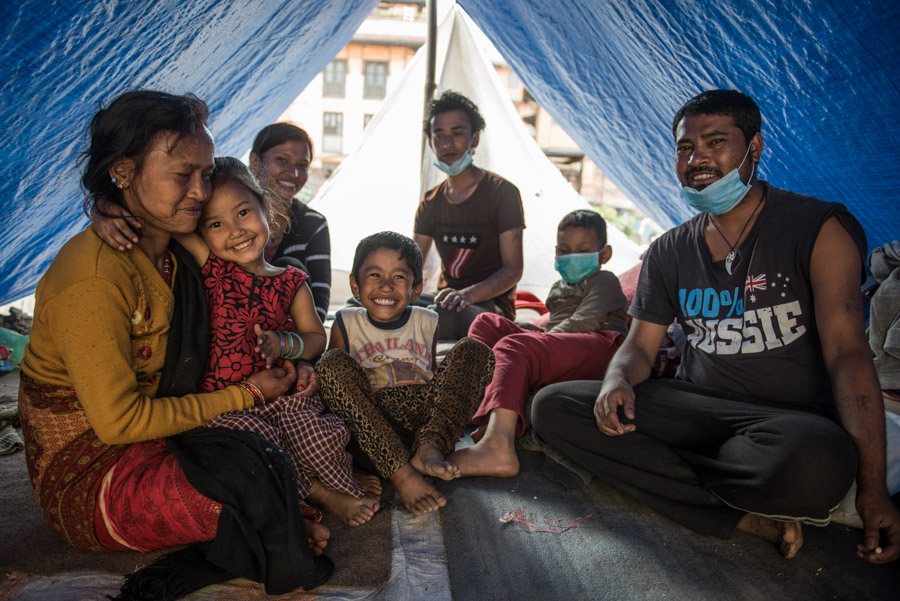 A smiling family in a tent in in Bhaktapur on May 3, 2015.