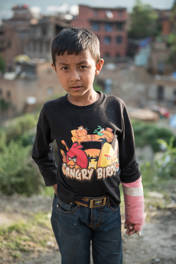 A young boy who broke his arm during the earthquake stands on the edge of a camp for displaced people in Bhaktapur on May 3, 2015.