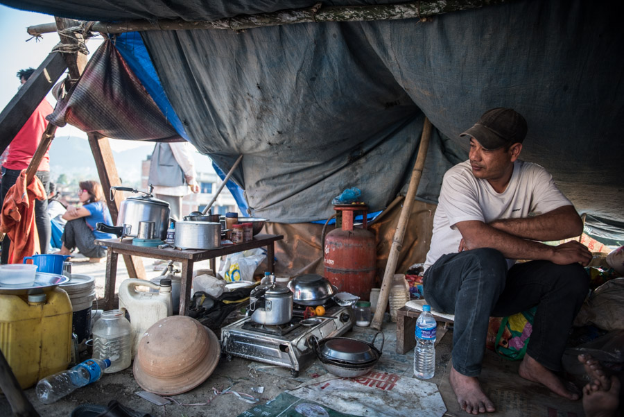 A man sits by a gas stove in his temporary tent in in Bhaktapur on May 3, 2015.