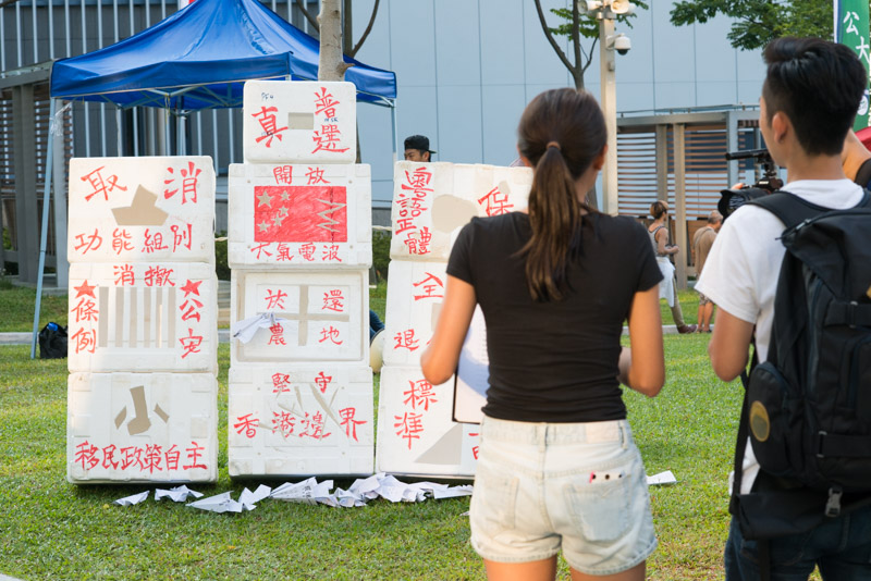In this impossible homemade game/satirical art installation , participants aimed paper airplanes at holes cut into boxes with different labels, like “real universal suffrage”, “adhere to Hong Kong borders”, “free migration policies”, and “cancel functional constituencies” (the professional or special interest groups that elect 30 LegCo seats).