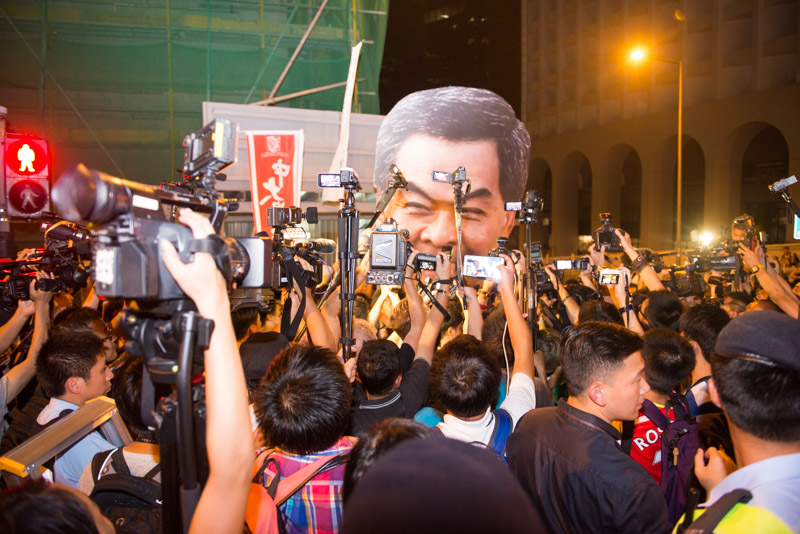 The reporters, most of which were waiting on Lower Albert Road, swarmed the front of the march when the giant CY the Vampire Chief Executive sign showed up.