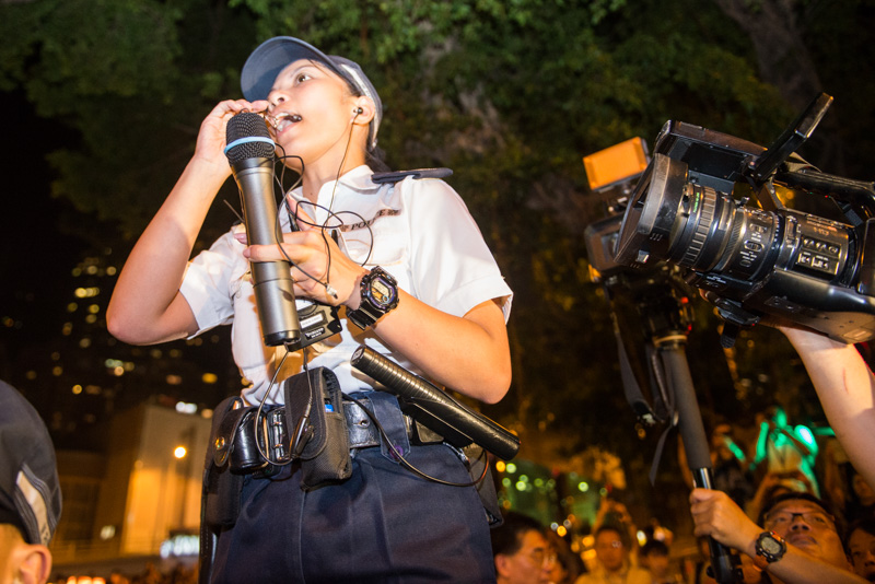 A policewoman, stood atop a stepladder, talking over a loudspeaker.