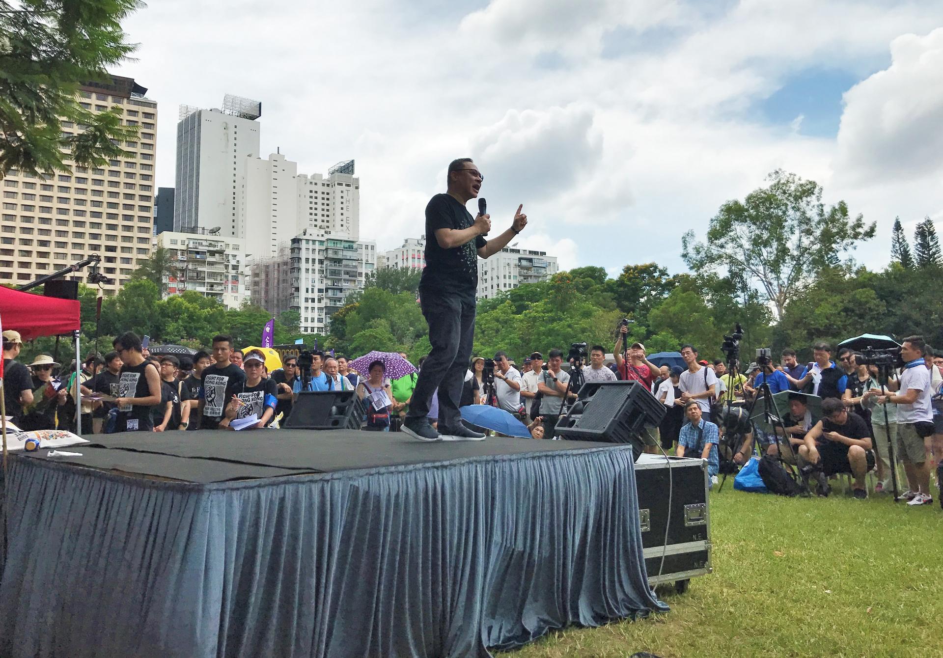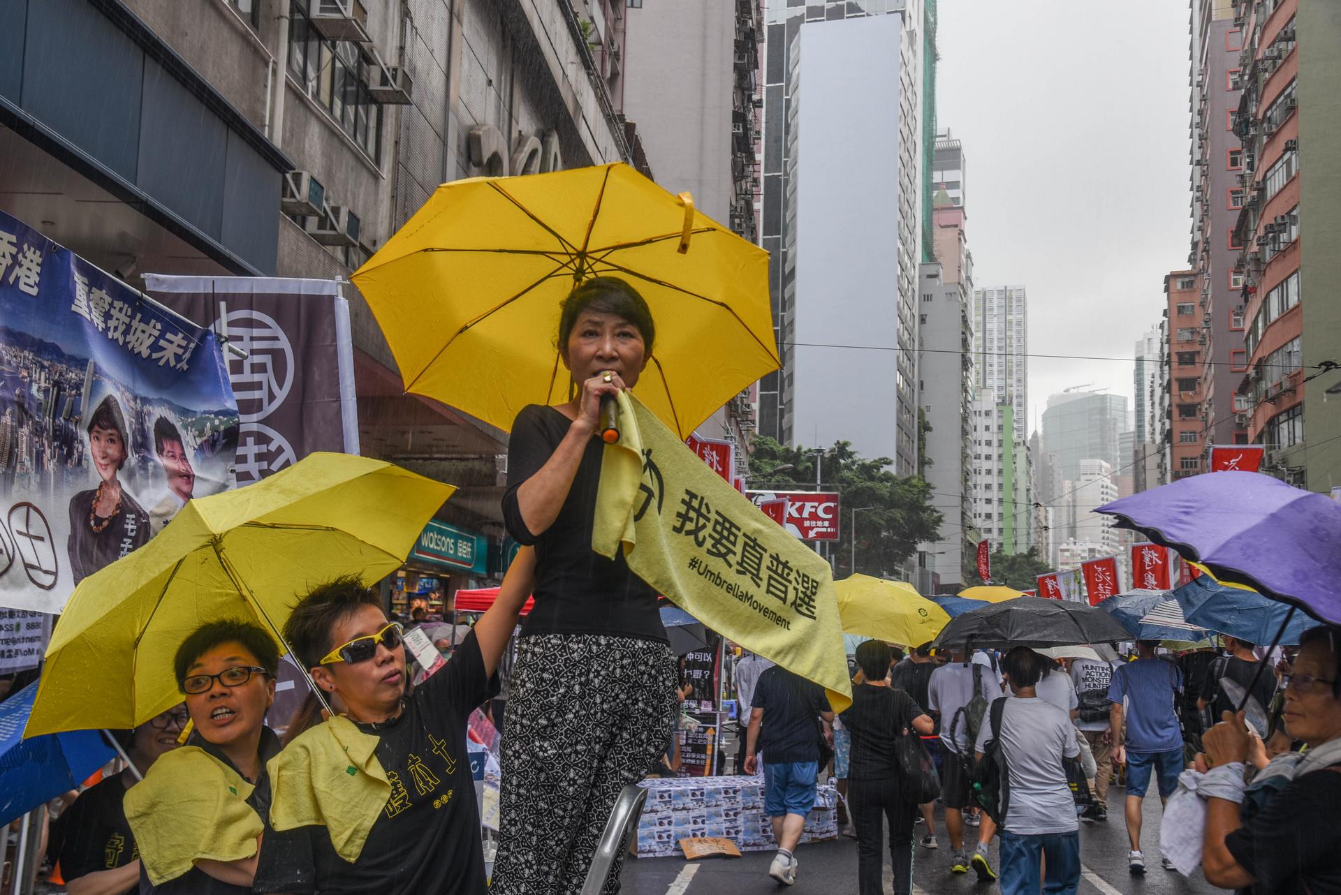 Protesters instead gathered at the park’s considerably smaller Central Lawn, where they stood under the blazing sun and occasional downpour (hey, this is Hong Kong after all) listening to speeches from pro-democracy figures.