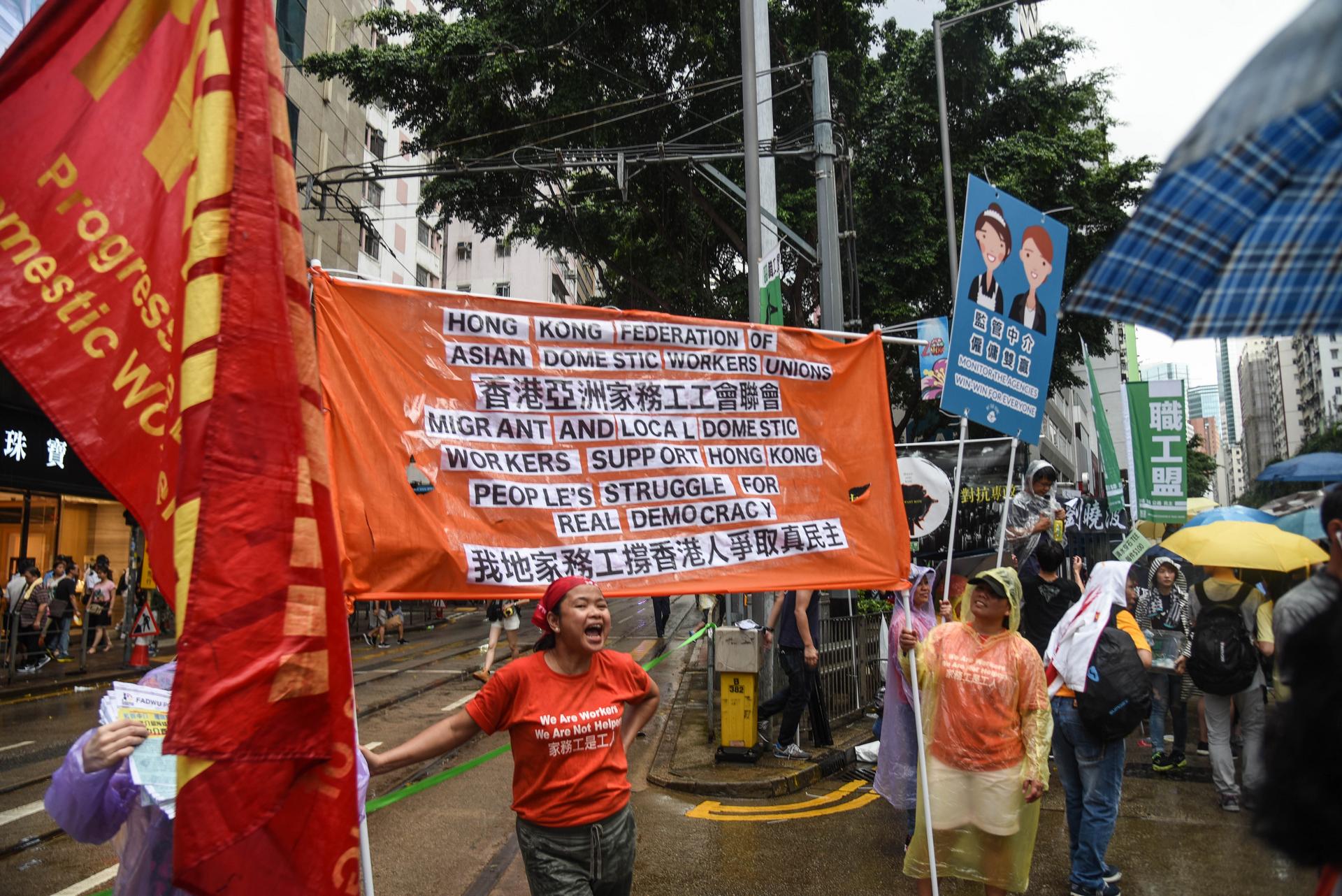 Also supporting the march was a small but vocal representation of the Domestic Workers Union, who chanted, “We want genuine universal suffrage” in Cantonese, winning cheers from the protesters themselves.