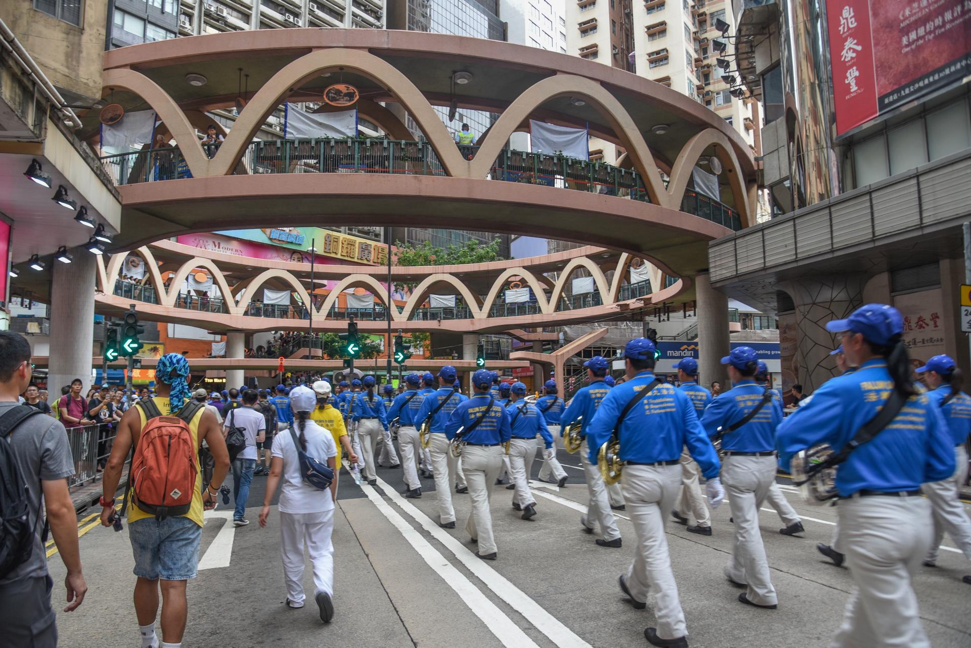 Onlookers observed the march from bridges, side streets, and inside glassy malls.
