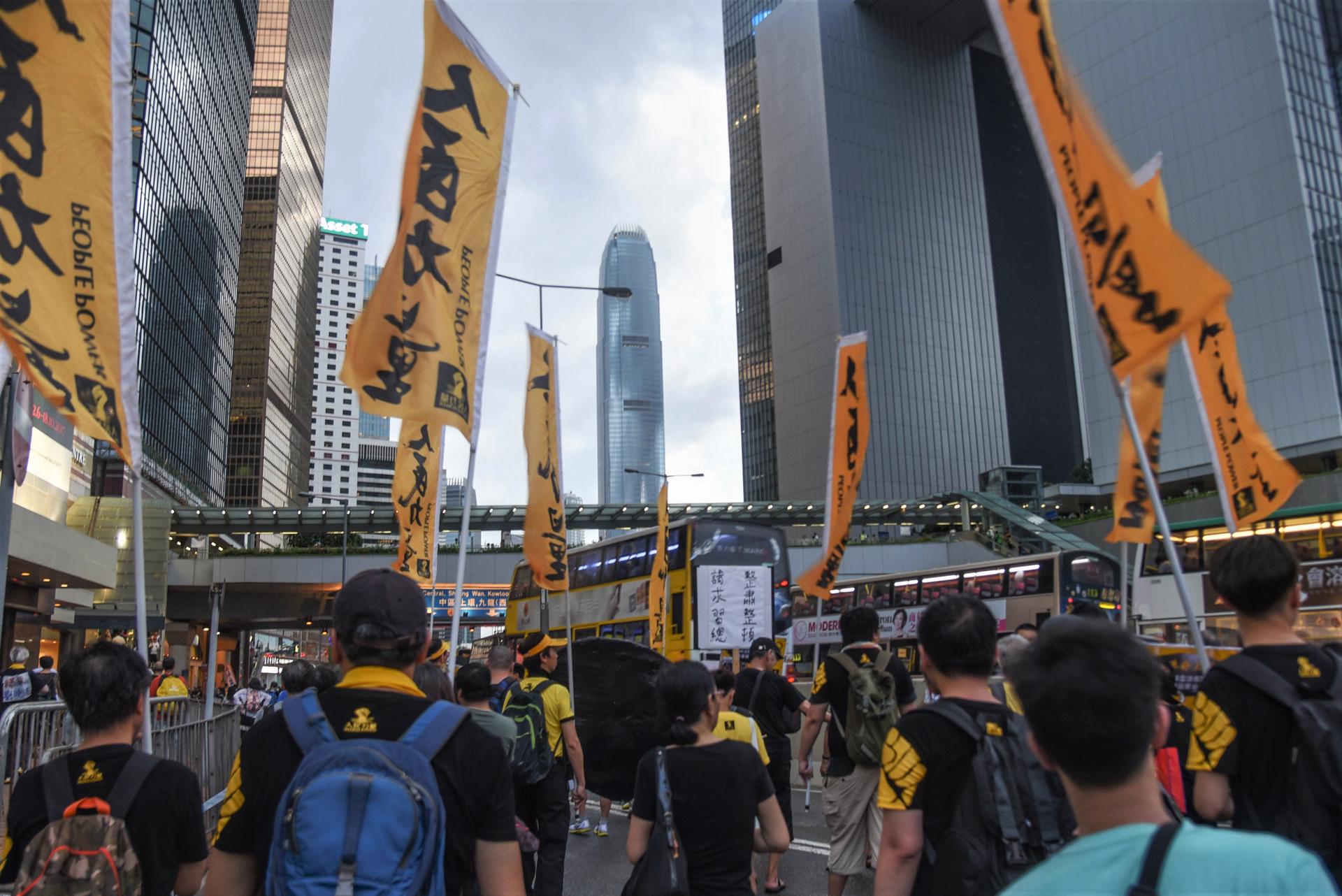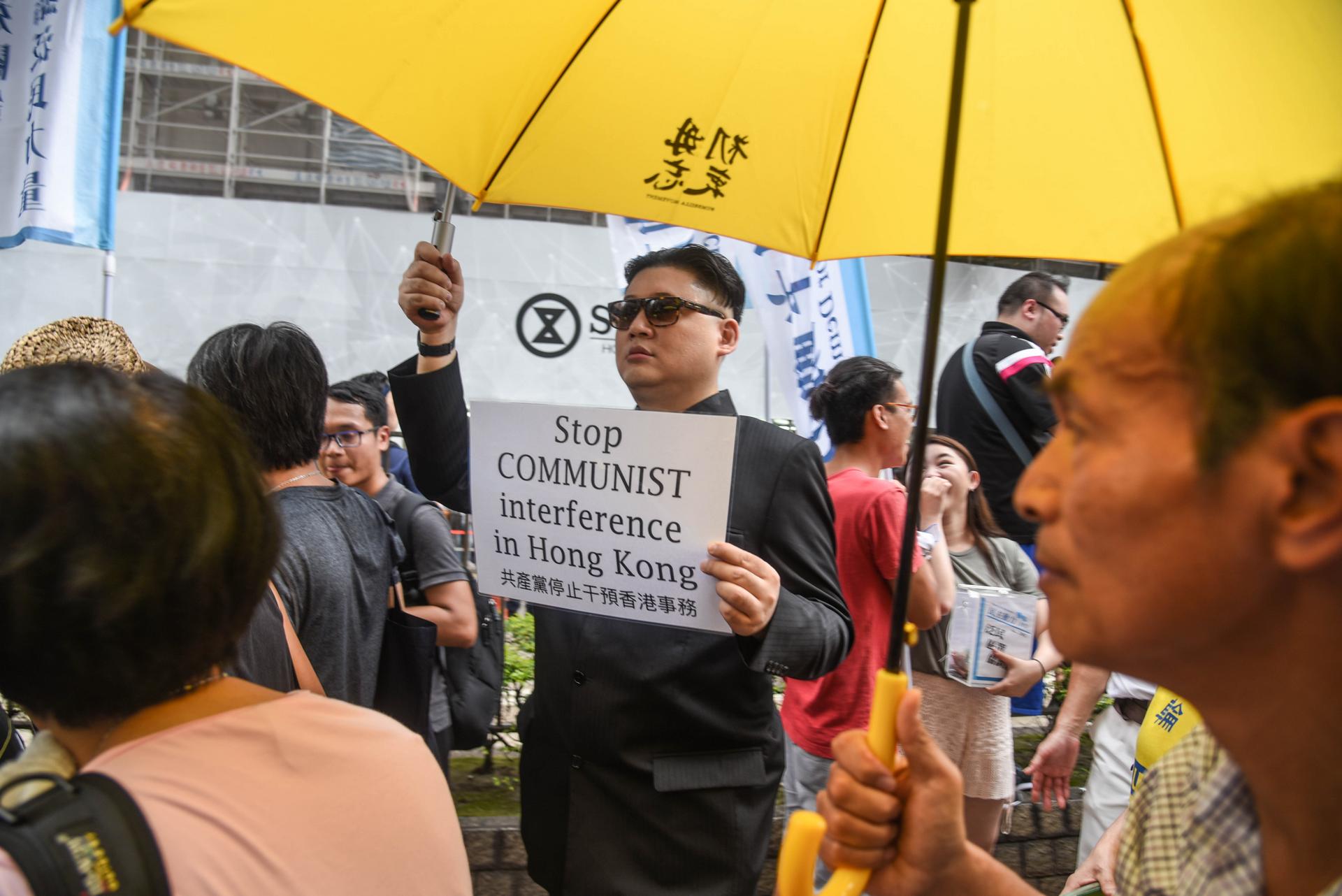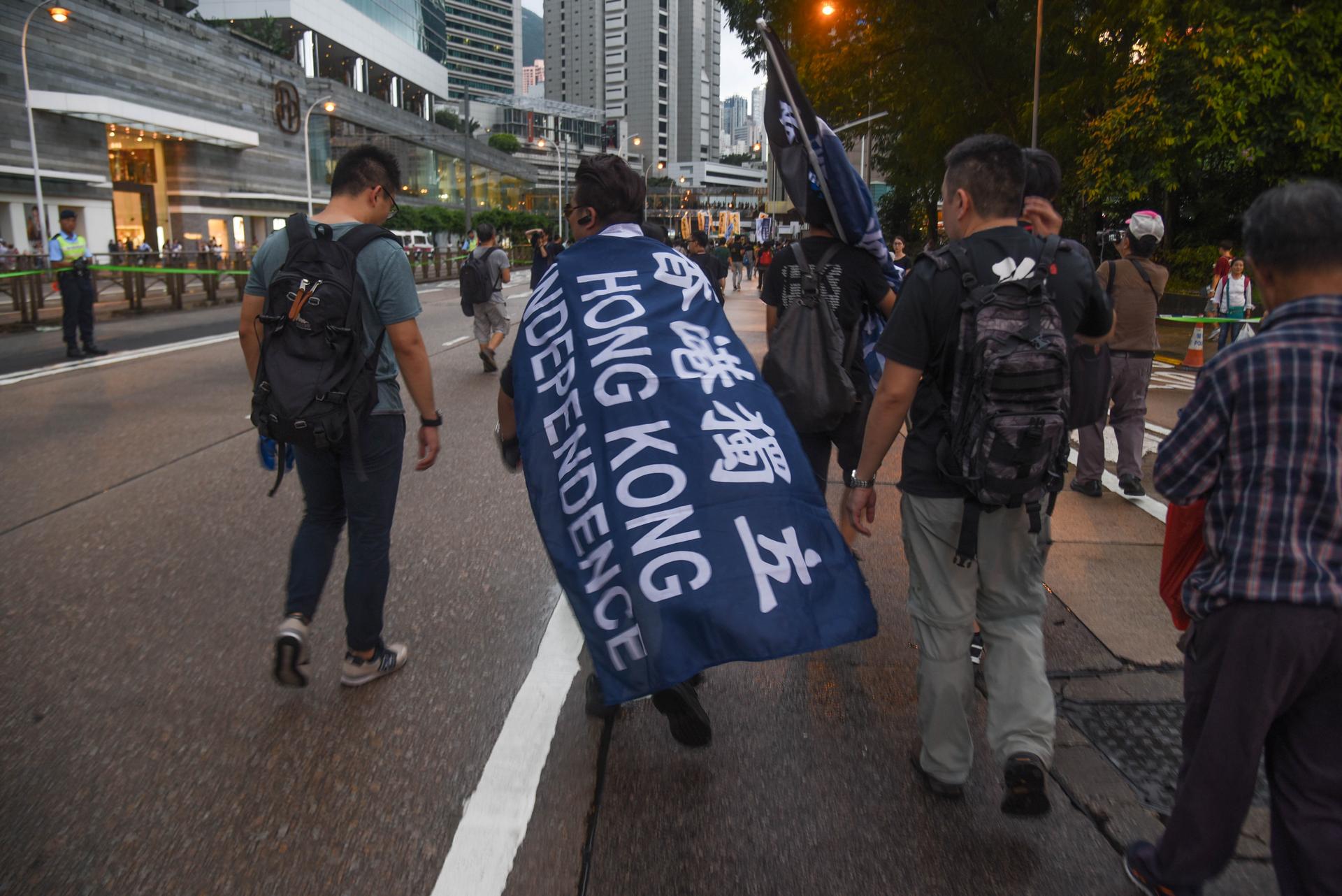 Also represented was the small but vocal faction of independence supporters, who waved colonial flags and carried funereal signs reading “Hong Kong: 20 Years a Slave”.